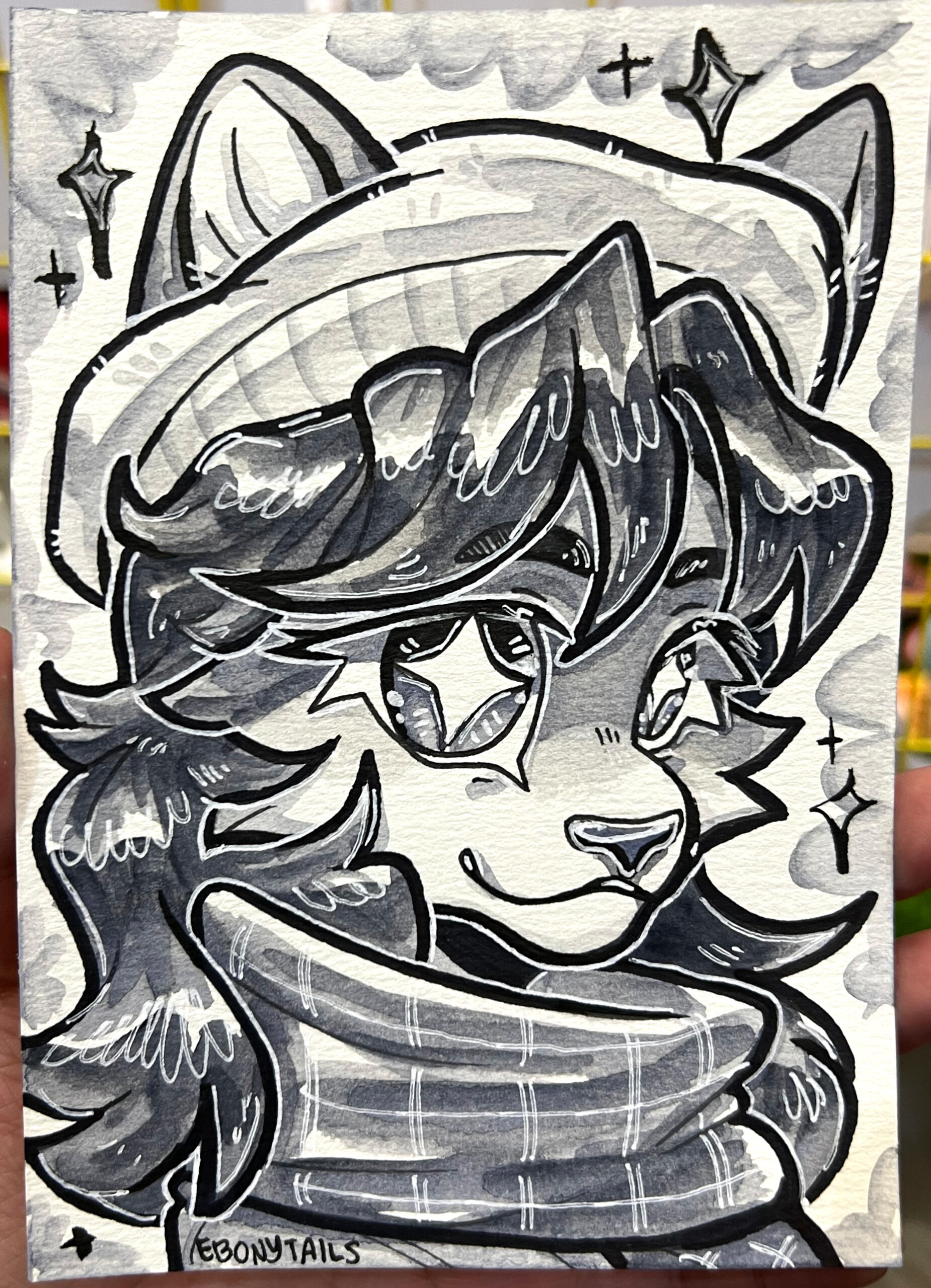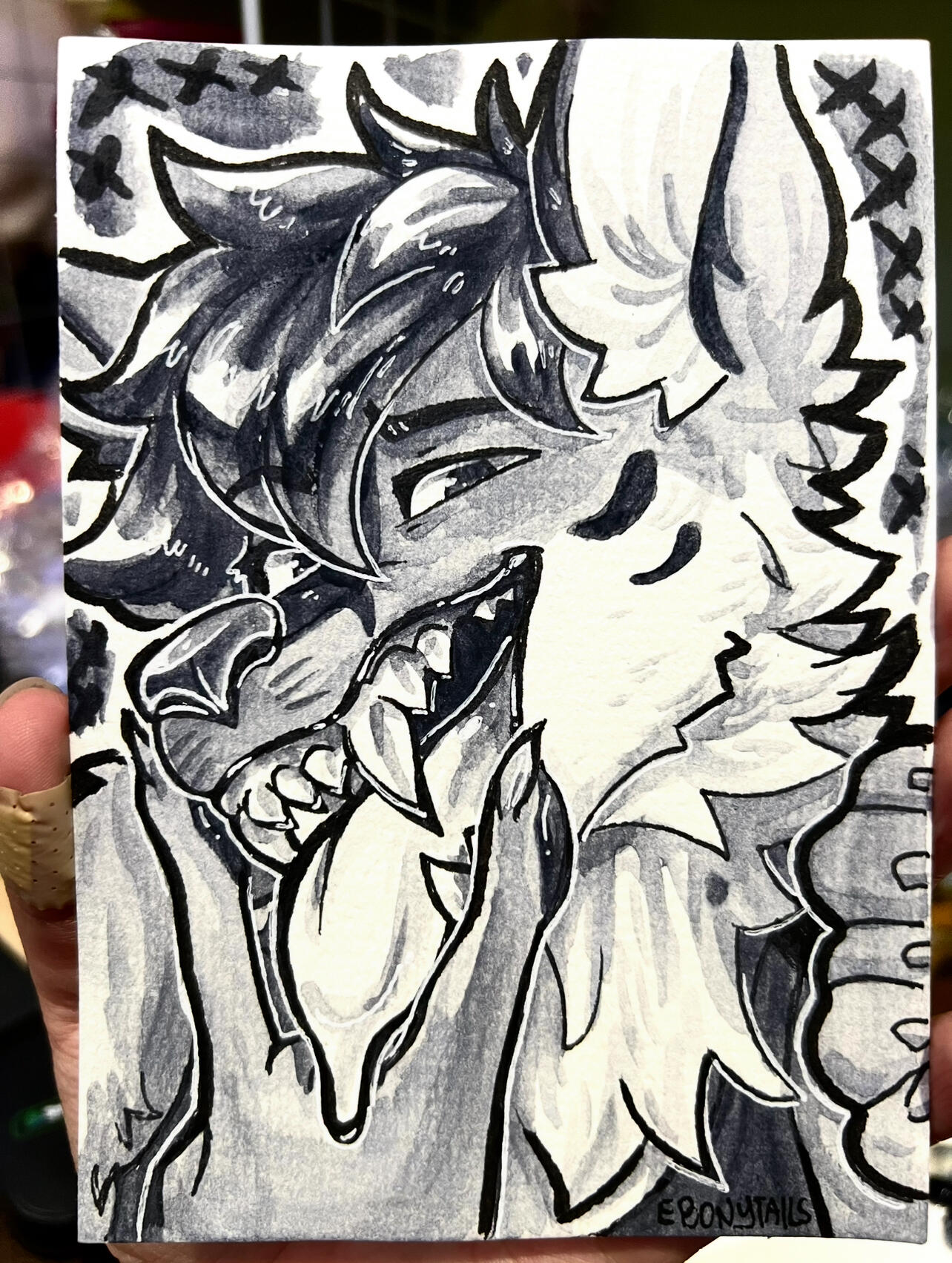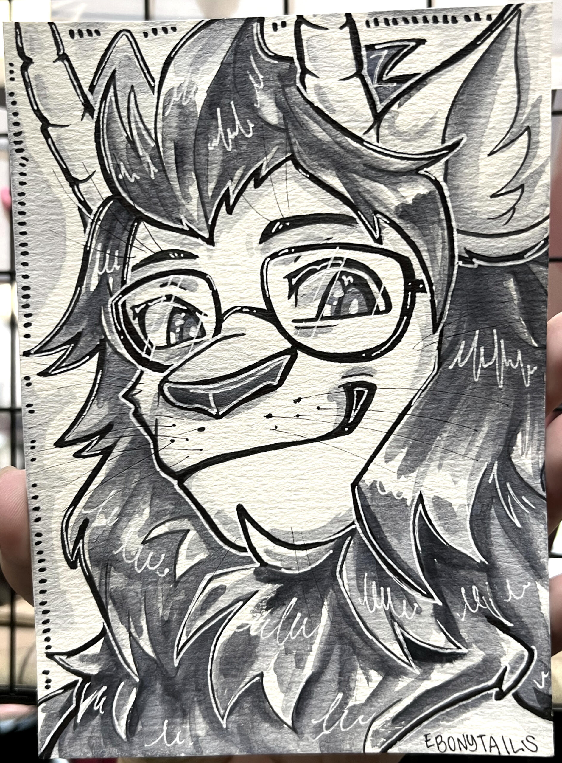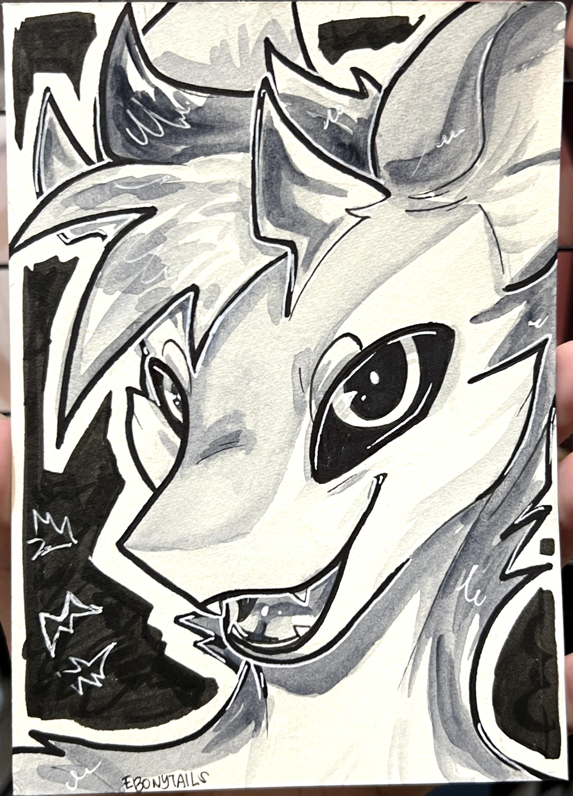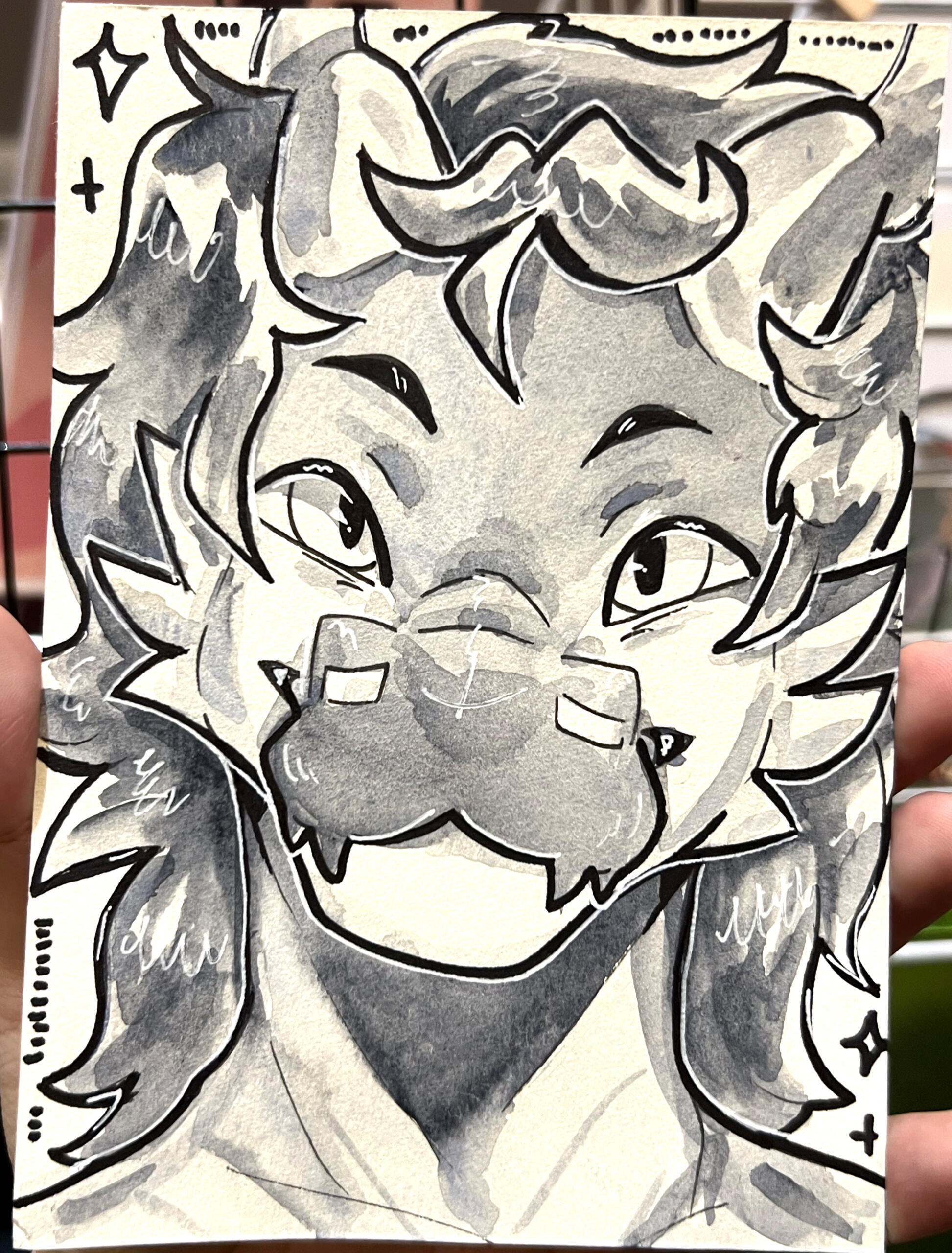 During events, I offer traditional art commissions! These are small pieces on A6 watercolor paper cards where I either draw in only black and white ink, or paint with watercolor using a grayscale palette!I tend to close slots very early WITHIN 3 hours of an event starting. Hence, I offer EARLY BIRD slots!