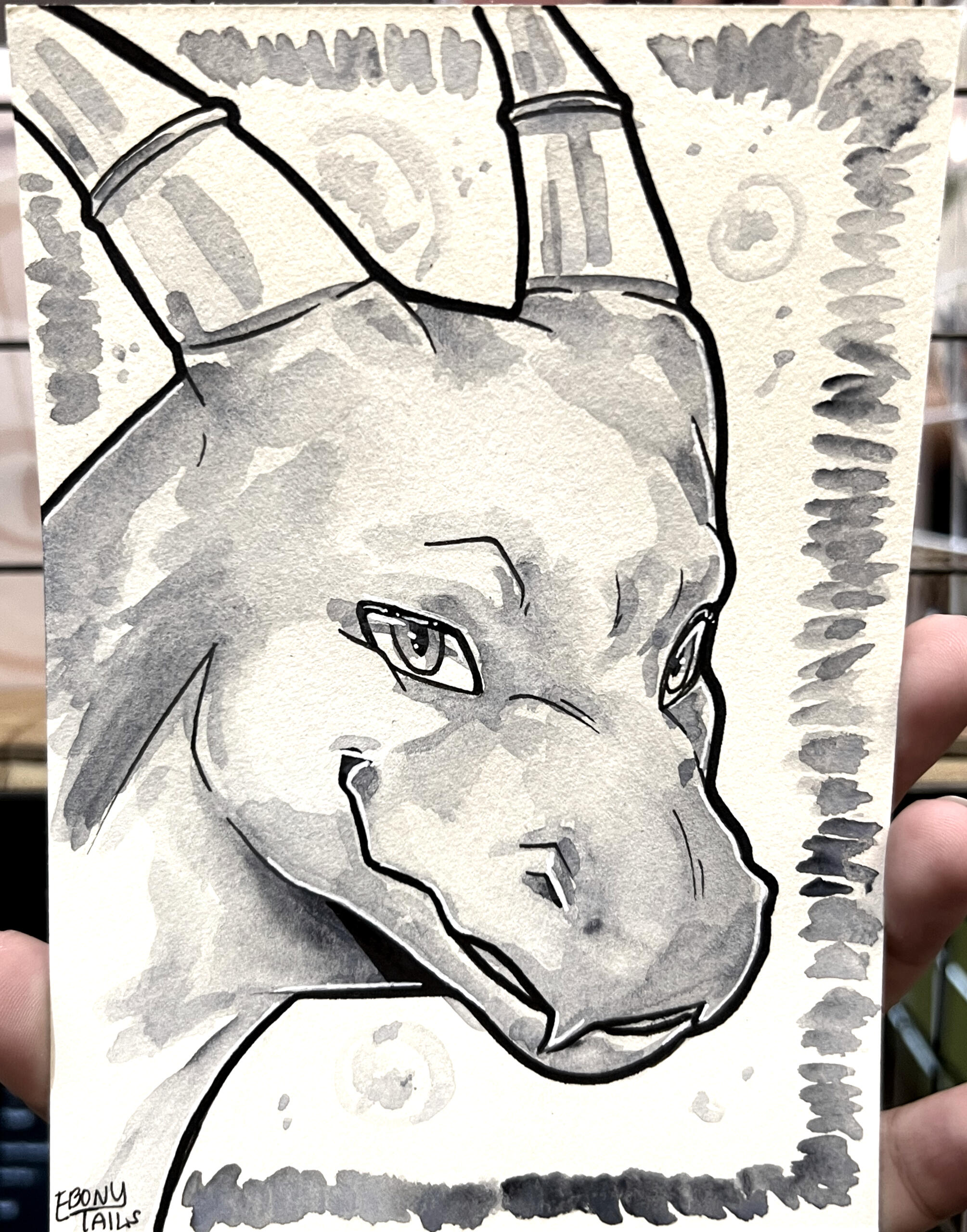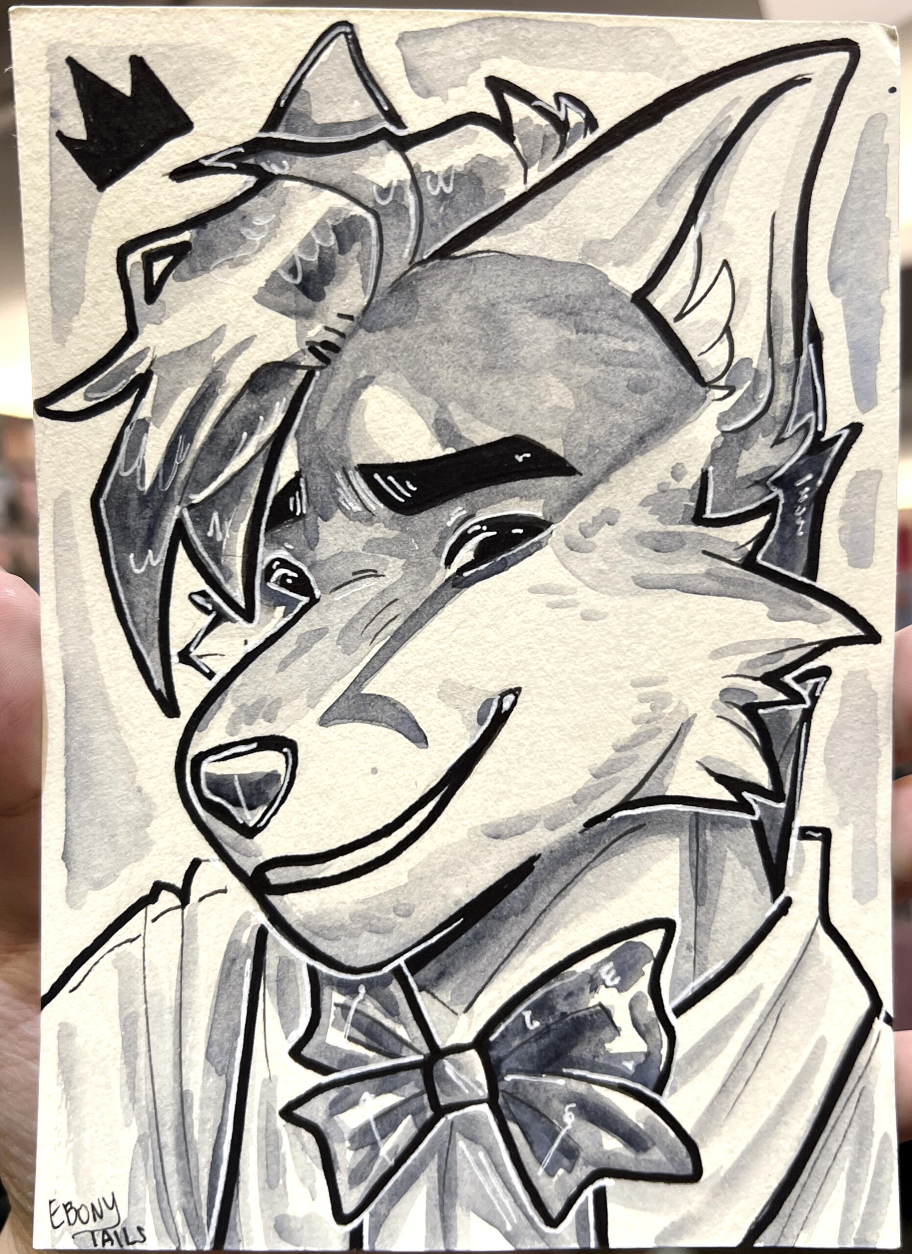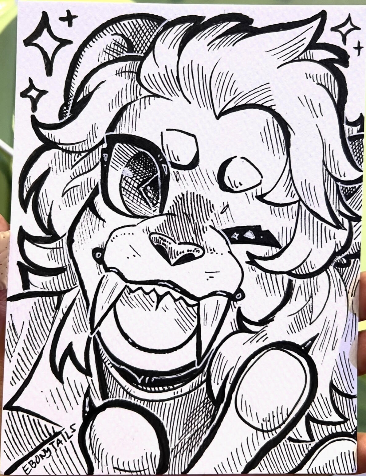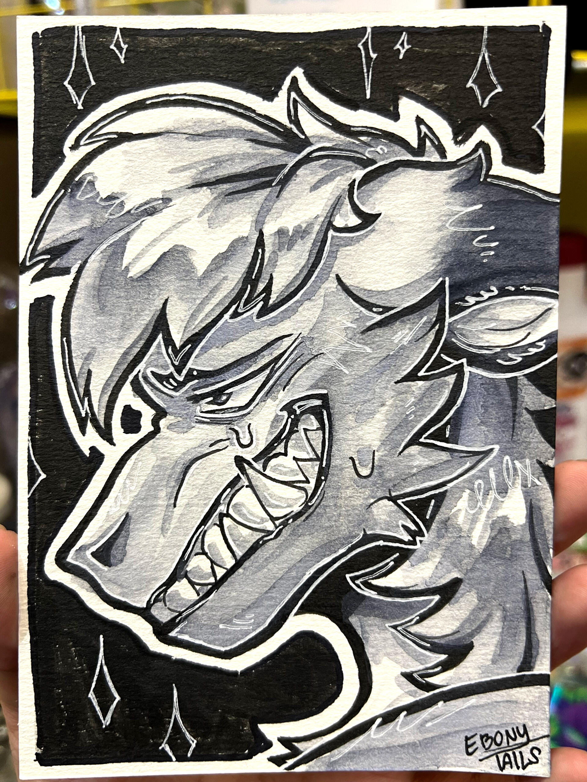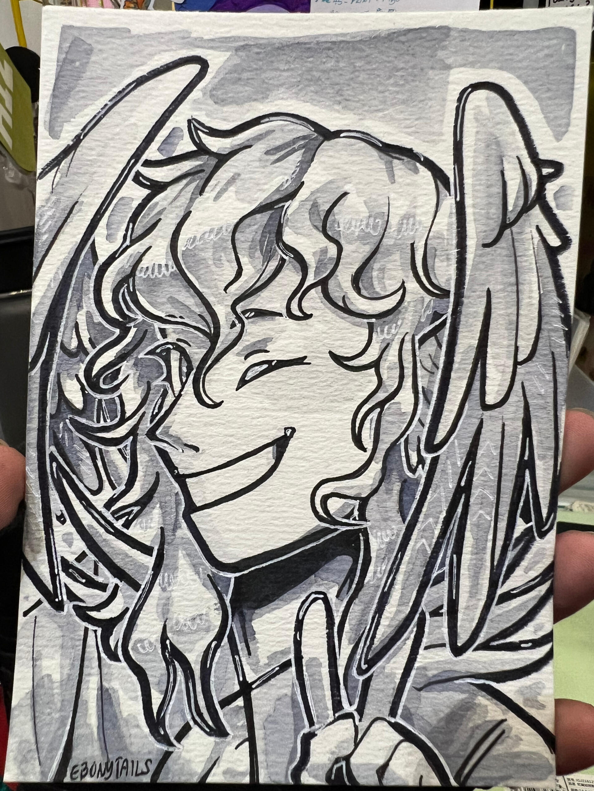 During events, I offer traditional art commissions! These are small pieces on A6 watercolor paper cards where I either draw in only black and white ink, or paint with watercolor using a grayscale palette!I tend to close slots very early WITHIN 3 hours of an event starting. Hence, I offer EARLY BIRD slots!