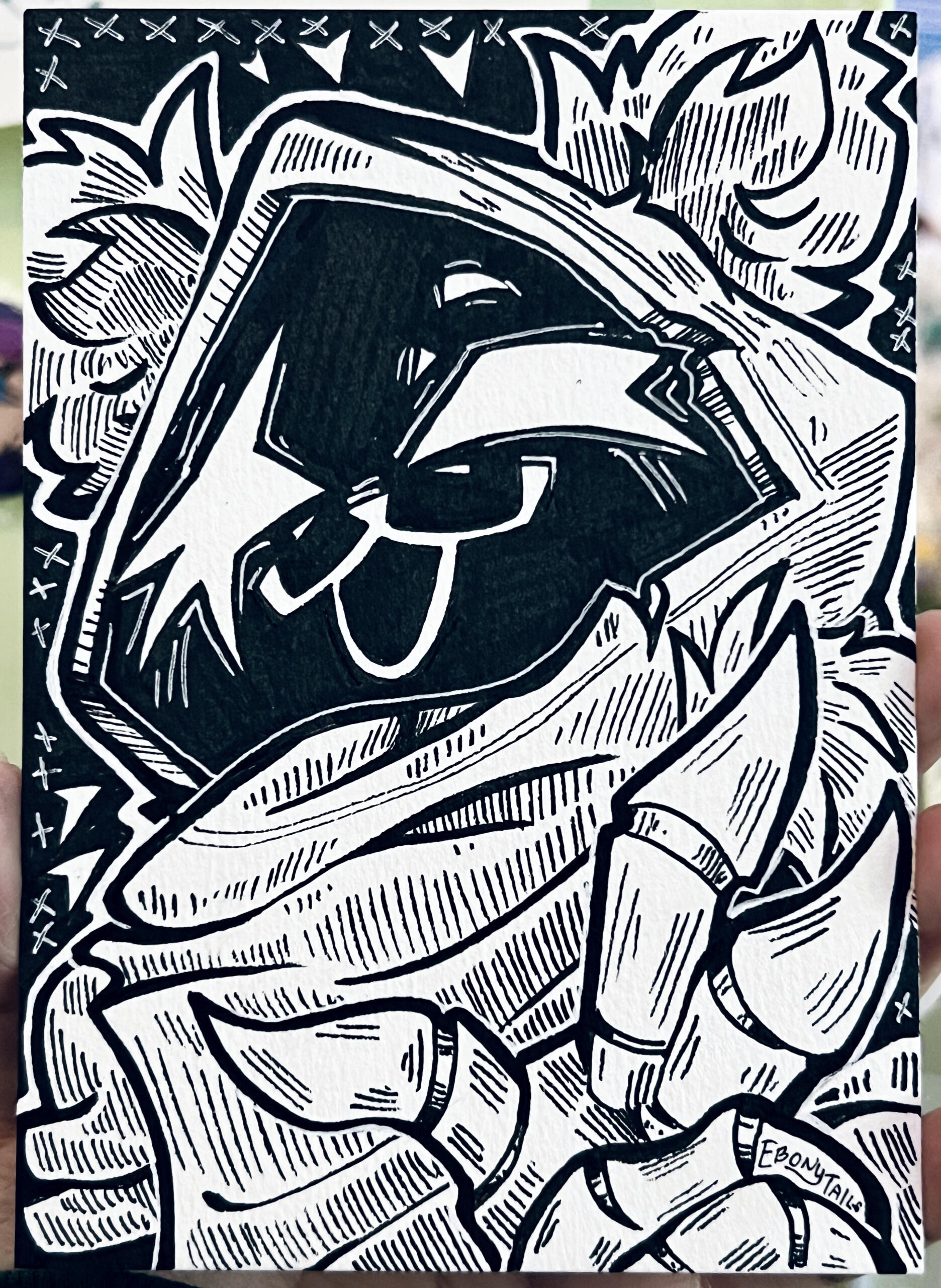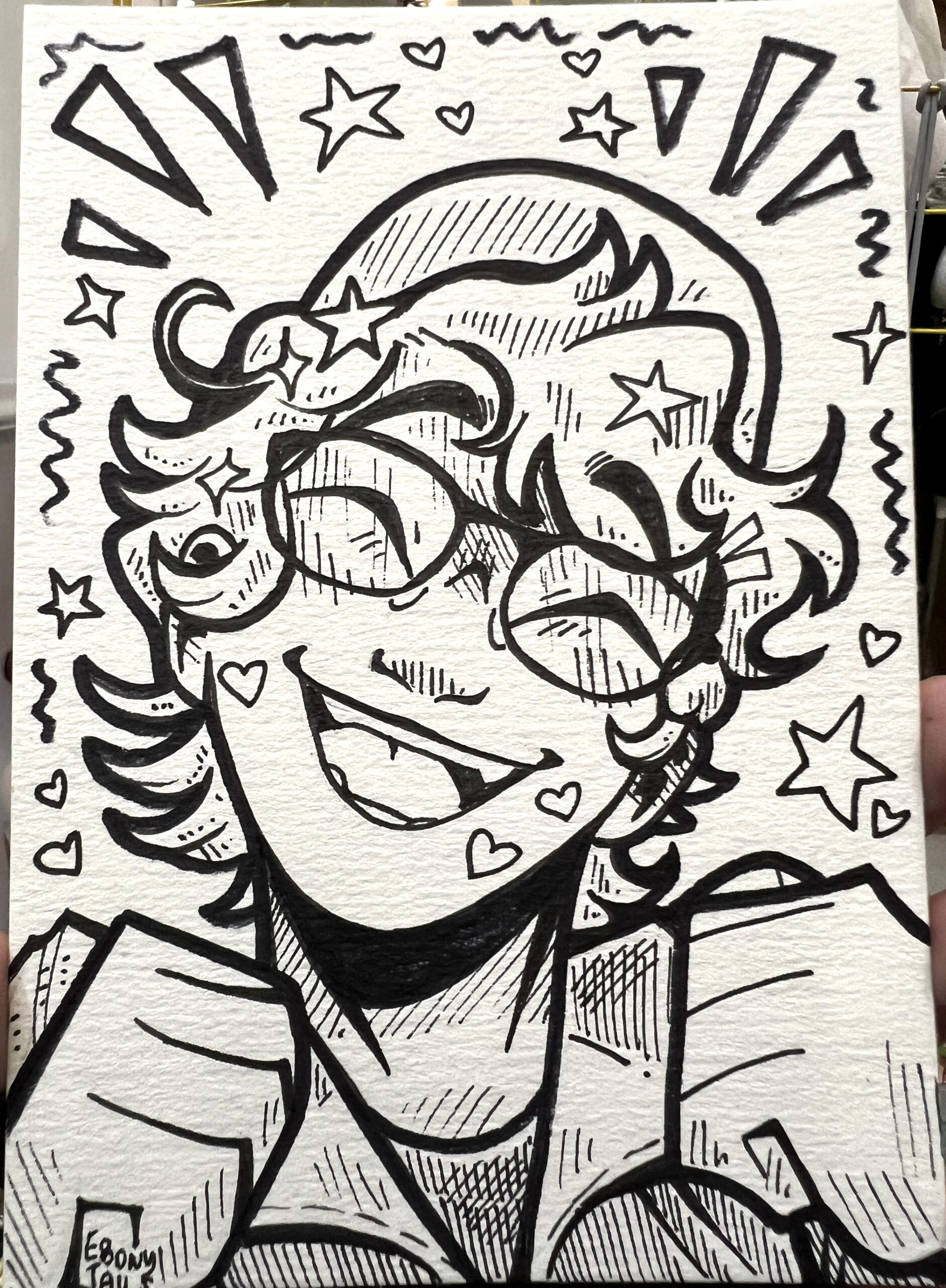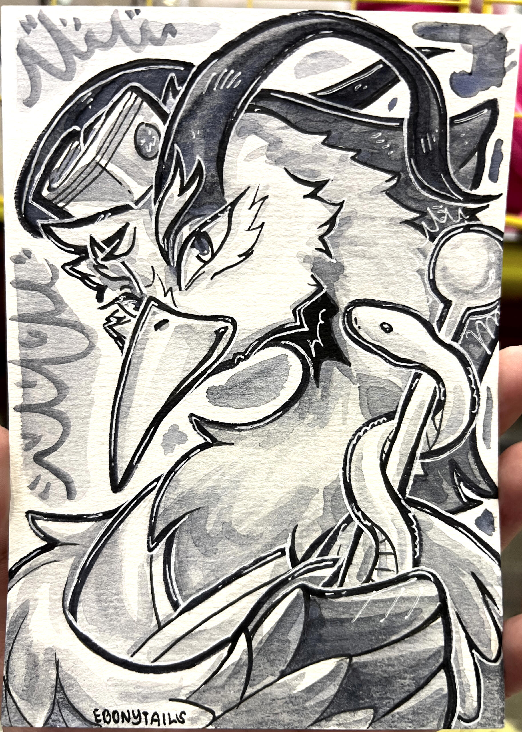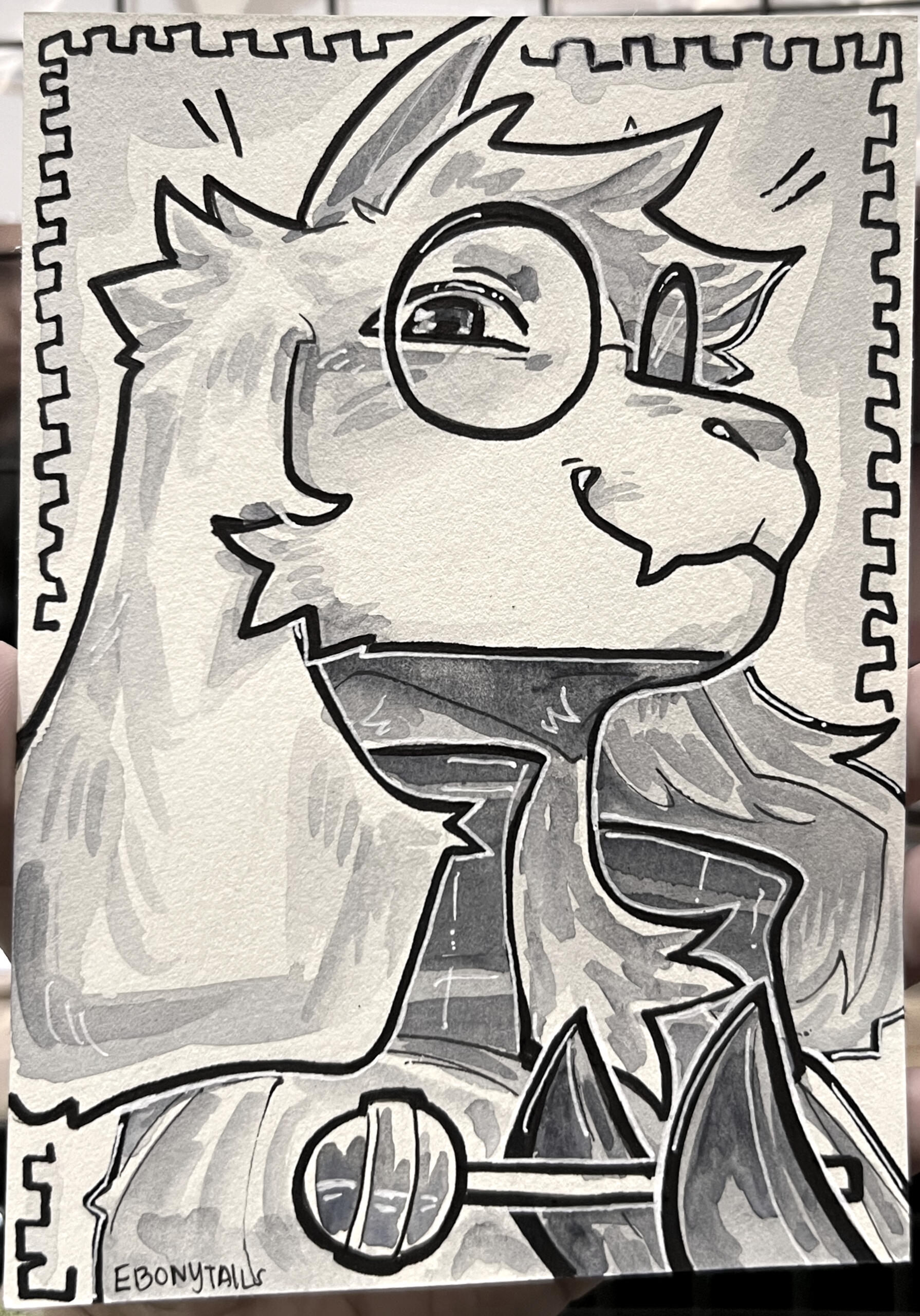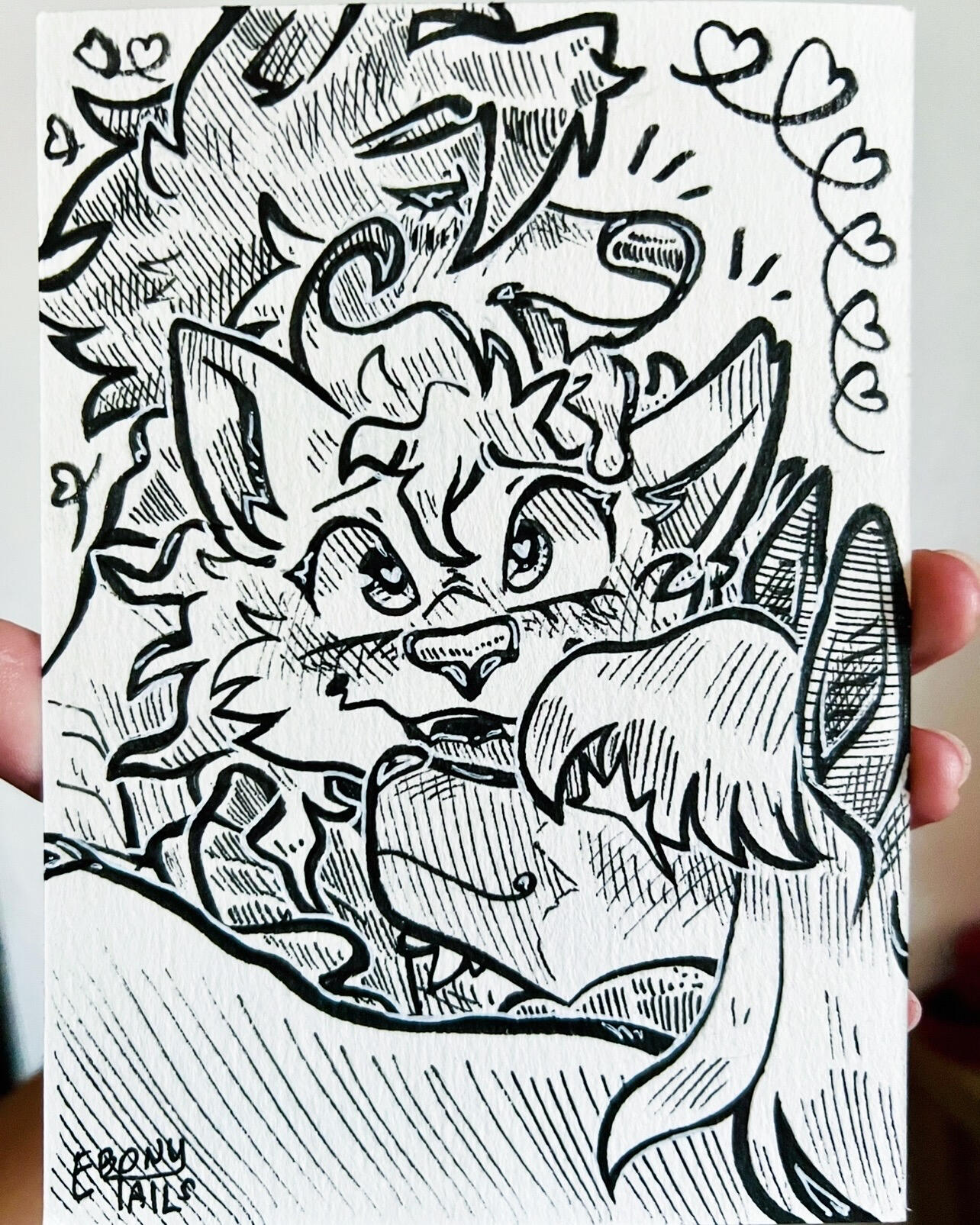 During events, I offer traditional art commissions! These are small pieces on A6 watercolor paper cards where I either draw in only black and white ink, or paint with watercolor using a grayscale palette!I tend to close slots very early WITHIN 3 hours of an event starting. Hence, I offer EARLY BIRD slots!